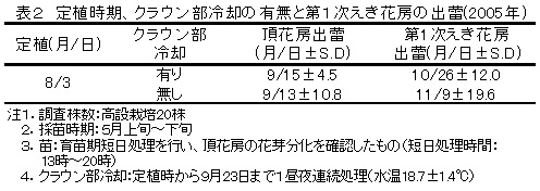 表2 定植時期、クラウン部冷却の有無と第1次えき花房の出蕾(2005年)