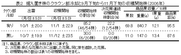表2 据え置き株のクラウン部冷却と9月下旬から11月下旬の収穫開始株(2006年)