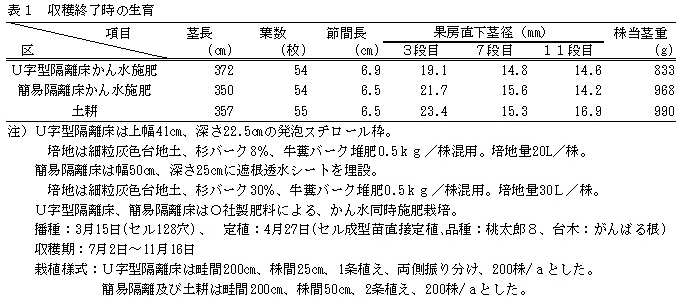 U字型隔離床を用いたかん水同時施肥栽培では、夏秋トマトのセル成型苗を直接定植しても初期生育を押さえ、その後の草勢も調節できる。また、遮根透水シートを用いた簡易隔離床栽培でも同様に草勢を調節できる(表1)。