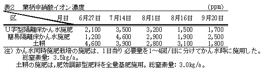 U字型隔離床栽培及び簡易隔離床栽培では、生育中の葉柄中の硝酸イオン濃度が変動しやすい(表2)。