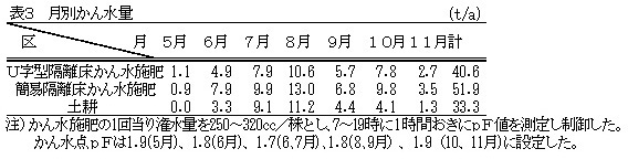 U字型隔離床栽培及び簡易隔離床栽培のかん水点pFは1.7〜1.9で順調に生育するが、かん水量は土耕栽培に較べ2割以上増加する(表3)。