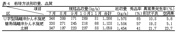 U字型隔離床を用いたかん水同時施肥栽培は、土耕栽培に比べ収量が向上し、形状不良果、空洞果が減少し秀品率が向上する。また、簡易隔離床栽培においても収量、秀品率が向上する。(表4)