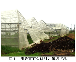 台風被害の調査結果から、資材固定用ボルトの切断、妻面の変形、基礎や溶接部の破壊が確認できた。これらの被害が生じた場合は、施設を修復する前に施設の増強方法について検討する必要がある。