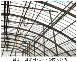 ボルトの抜け落ちや破断、天窓の破壊も多数確認された。前者はワッシャーなどの取り付けにより改善が期待でき、後者は固定方法の改善が必要である場合が多い。しかし、これらの防止対策は生産者(施設を利用している方)のメンテナンス作業によって対応できる場合も多く、生産者に注意を払うように指導することで対応できる(図2)。