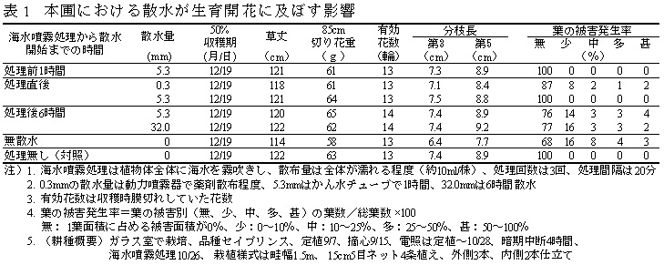 1)植物体に塩が付着後、散水を行わないと草丈、分枝長が短くなり、切り花重が軽くなる。