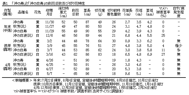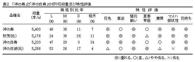 表2 「沖の寿」と「沖の白寿」の切り花収量及び特性評価