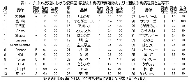 イチゴ品種「大村朱」、「宮崎」、「千代田」、「Selva」、「Shasta」、「Lassen」、「Senga Sengana」の7品種は、強度の疫病抵抗性を有し、疫病菌接種5週後まで病徴が生じず、生存率は100%である(表1)。