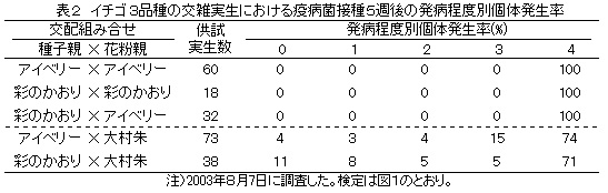 表2 イチゴ3品種の交雑実生における疫病菌接種5週後の発病程度別個体発生率
