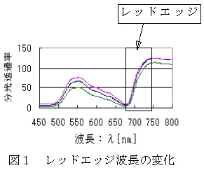 メロンやミカンなど高糖度の果実生産が要求される作物では、水切りを行い果実糖度を上げるが、栽培中の作物の水分状態の把握は、栽培者の勘に頼らざるを得ない。そこで、圃場で簡易に水分ストレスが測れるよう、長崎県工業技術センターが緑葉のレッドエッジ波長の変化を応用した非破壊の水分ストレス計測機を開発している。レッドエッジとは緑葉は赤色の光を良く吸収し(反射率は低い)、近赤外光を強く反射する。この低い反射率から高い反射率への変化域をレッドエッジという。現在、木本植物についてはストレスがかかると、レッドエッジ波長は青波長(短波長)側へ移行する現象が知られている(図1)。そこで、メロンなど草本類に水分ストレスを与えた場合、この現象が起きるか検証するため、外的要因(気象、肥効等)の影響を極力受けていない段階であるメロンの幼苗期における水ポテンシャルと分光反射特性との関係を検討する。