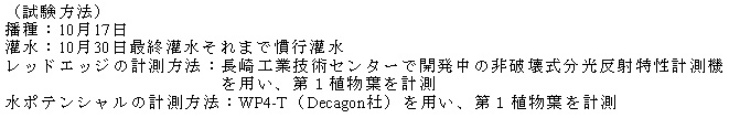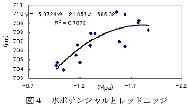 - 樹木の場合、水分ストレスを与えるとレッドエッジは青波長側へ移行するが、幼苗期のメロンは、水分ストレスを与えると葉色は濃くなりレッドエッジは赤波長側へ移行する。このときレッドエッジの赤波長側への移行と水ポテンシャルの移行には高い相関がある。