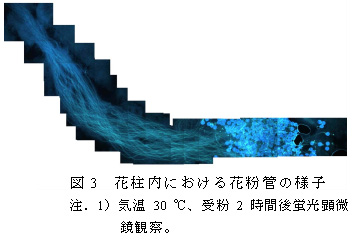 受粉2時間後の花粉管伸長は摂氏20度が1.94mm、摂氏30度が3.66mmで、摂氏30度の方が長いことから、花粉管伸長は温度が影響する(表1)。