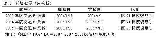 - そこで、有利販売につながるオリジナル性があり、様々な作型に適応した栽培しやすい品種を育成するため、優良固定系統を親としてF1系統の育成を行っている。今回、効率的なF1系統育成を行うために、F1系統の両親系統とF1系統の早晩性を調査した。