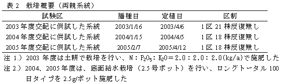 両親系統の早晩性は、市販品種(早生・中生・晩生)を対照に、一番花開花日を基準にして分類した(具体的データはなし)。