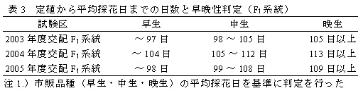 表3 定植から平均採花日までの日数と早晩性判定(F1系統)