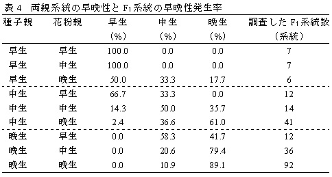 表4 両親系統の早晩性とF1系統の早晩性発生率