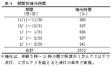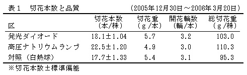 高圧ナトリウムランプによる4,000ルクス程度の補光区は、茎頂葉の展開速度が速く(データ省略)、切り花数が増加する。しかし、開花輪数が少なくステムが短いことから他区より品質が劣る(表1)。