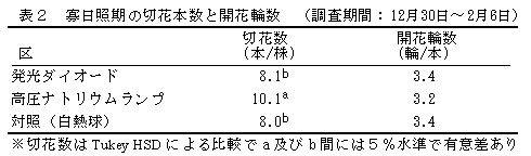 表2 寡日照期の切花本数と開花輪数(調査期間:12月30日〜2月6日)