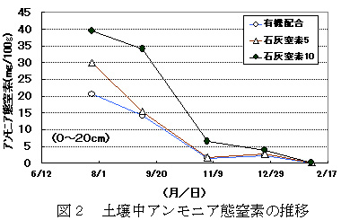 深刈り直後の窒素量10kg/10a程度の石灰窒素入り複合肥料の施用により、その後の硝酸化成が抑制されるため土壌中のアンモニア態窒素含量は高く推移する(図2)。