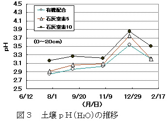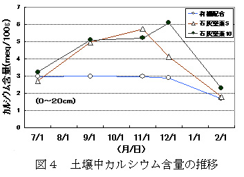 石灰窒素入り複合肥料を施用すると土壌pHは高めに推移し、土壌中のカルシウム含量も高く推移するが、更新処理時における窒素量10kg/10a程度の施用は問題ない(図3、図4)。