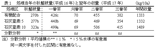 深刈り直後の窒素量10kg/10a程度の石灰窒素入り複合肥料の施用により、当年の秋整枝量と翌年の一番茶収量は高まり、品質の低下もない(表1、表2)。
