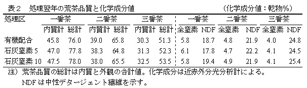 表2 処理翌年の荒茶品質と化学成分値(化学成分値:乾物%)