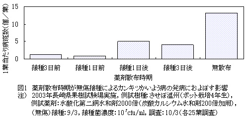 - 台風による傷感染を想定した接種試験では、水酸化第二銅水和剤を用いた薬剤散布の効果は、無傷接種(図1)および付傷接種(図2)ともに接種3〜1日前の散布で高く、接種後の散布では効果は低下する。