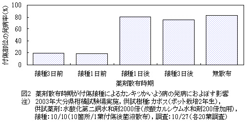 図2 薬剤散布時期が付傷接種によるカンキツかいよう病の発病におよぼす影響