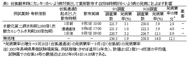 台風接近時に行った防除試験では、台風が接近する前に水酸化第二銅水和剤を散布した場合には高い防除効果を示すが、台風通過後に散布すると時間の経過とともに低下し、1日後の散布では発病を抑制する効果は低くなる(表1)。