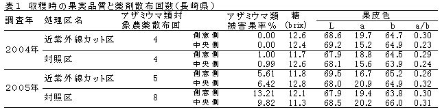 表1 収穫時の果実品質と薬剤散布回数(長崎県)
