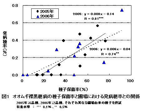 - エンブリオ・テスト(International Rules for Seed Testing:http://seedtest.org/upload/cms/user/7013.pdf)によって調査したオオムギの裸黒穂病種子保菌率と圃場での発病穂率の間には、正の相関がみられる。ただし、種子保菌率に対し発病穂率は非常に低く、保菌率が低い場合には圃場での発生はほとんど見られない(図1)。