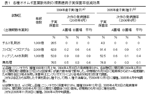 表1 各種オオムギ茎葉散布剤の裸黒穂病子実保菌率低減効果