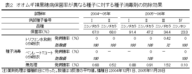 トリフミン水和剤0.5%種子粉衣、ベンレートTコートの0.5%種子粉衣による種子消毒は、裸黒穂病保菌率が高い種子に対しても非常に高い効果を示す(表2)。