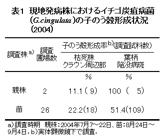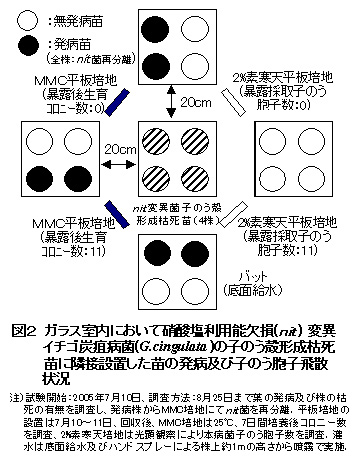 図2 ガラス室内において硝酸塩利用能欠損(nit)変異イチゴ炭疽病菌(G.cingulata)の子のう殻形成枯死苗に隣接設置した苗の発病及び子のう胞子飛散状況