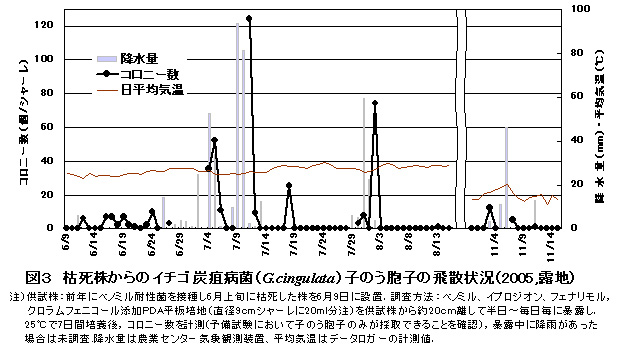 図3 枯死株からのイチゴ炭疽病菌(G.cingulata)子のう胞子の飛散状況(2005,露地)