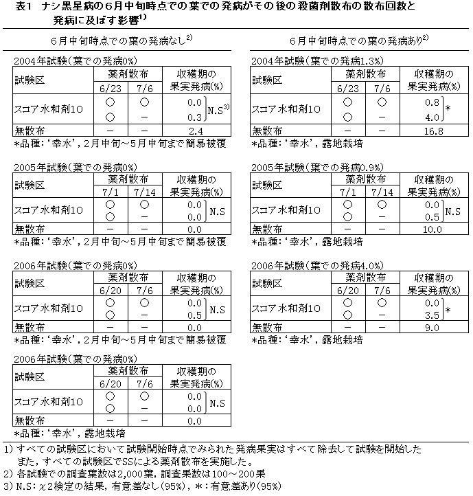 表1 ナシ黒星病の6月中旬時点での葉での発病がその後の殺菌剤散布の散布回数と発病に及ぼす影響1)