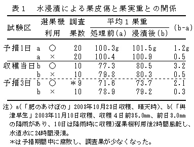 水浸漬した果実の重量変化から果皮傷の発生程度を推定したところ、選果機の利用、収穫当日の選果、降雨時の収穫が果皮傷発生要因として重要である。