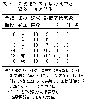 表2 果皮傷後の予措時間数と緑かび病の発生