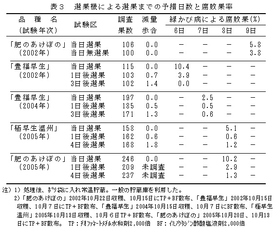 収穫当日の選果機利用は、緑かび病の発生を助長する。しかし、短期常温予措(一般に利用されている倉庫で24時間以上(減量歩合0.6%程度)貯蔵する)を行うことにより、選果機を利用しても緑かび病による果実腐敗が抑制できる(表3)。