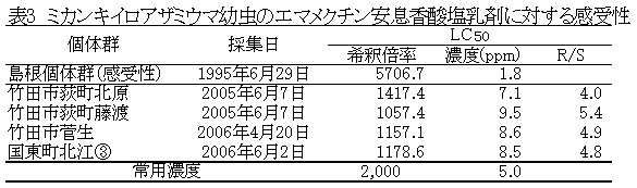 表3 ミカンキイロアザミウマ幼虫のエマメクチン安息香酸塩乳剤に対する感受性