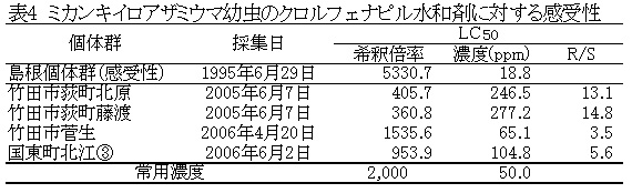 表4 ミカンキイロアザミウマ幼虫のクロルフェナピル水和剤に対する感受性