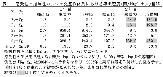- 1年目感受性−2年目抵抗性カンショ交互作体系では、線虫密度は1年目に極めて高くなるものの、2年目の抵抗性品種作付によって速やかに低下する(表1)。