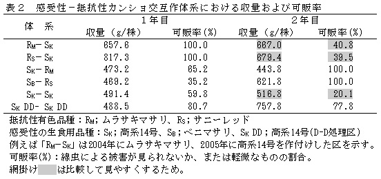 表2 感受性−抵抗性カンショ交互作体系における収量および可販率