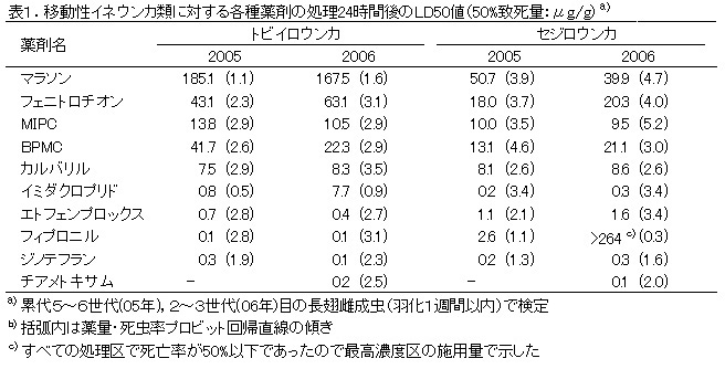 トビイロウンカに対するフィプロニルとセジロウンカに対するイミダクロプリドでは、LD50値は0.3以下と低い値であり、薬剤感受性の変化は認められない(表1)。