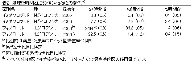セジロウンカに対するフィプロニルについては、48、72時間後のLD50値は24時間後に比べて顕著に低下したことから(表2)、本薬剤は処理24時間後では効果の発現が十分でない。