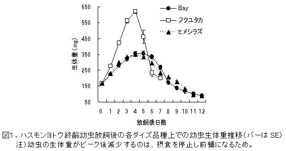 終齢(6齢)幼虫をダイズ株上に放飼した試験において、「Bay」は「ヒメシラズ」と同様な生体重変動を示し(図1)、「Bay」上の個体は感受性品種「フクユタカ」に比べ有意に幼虫期間が長く蛹重も軽い(表1)。さらに「Bay」および「ヒメシラズ」上では「フクユタカ」に比べ蛹化率が極端に低く(表1)、ほとんどの幼虫が蛹になれず死亡する。