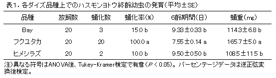 表1 各ダイズ品種上でのハスモンヨトウ終齢幼虫の発育(平均±SE)