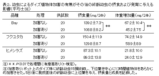 表2 幼虫によるダイズ植物体加害の有無がその後の終齢幼虫の摂食および発育に与える影響(平均±SE)