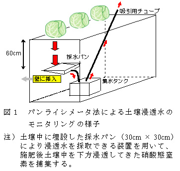 少雨条件においてパンライシメータ法(図1)により冬作キャベツ畑の土壌浸透水をモニタリングした結果、施肥由来の硝酸態窒素は収穫期(2月上旬)以降降雨に伴い根域外に多量に溶脱する(図2)。
