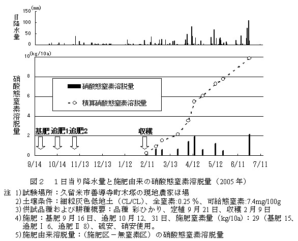 図2 1日当り降水量と施肥由来の硝酸態窒素溶脱量(2005年)
