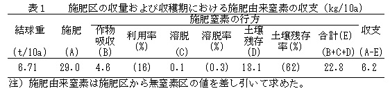 表1 施肥区の収量および収穫期における施肥由来窒素の収支(kg/10a)